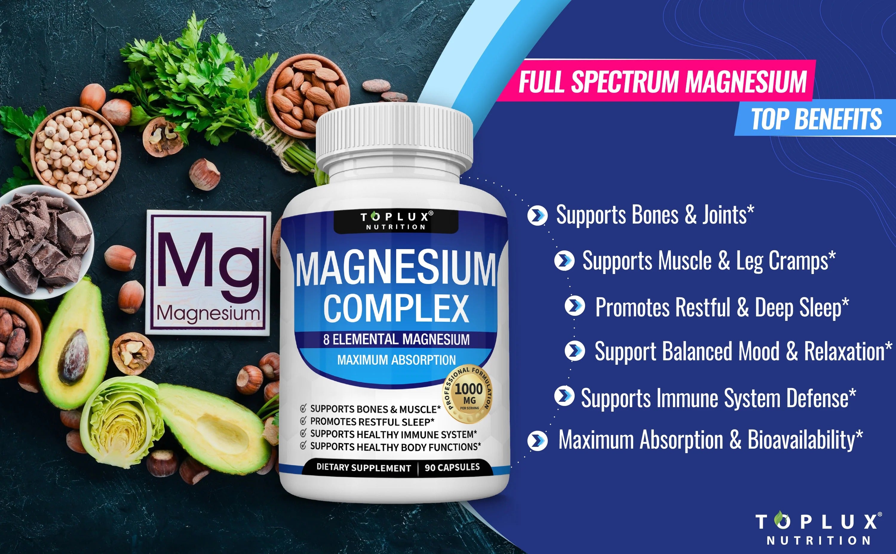 Magnesium Complex Supplement 8 Elemental 1000mg - Magnesium Glycinate, Citrate, Malate, Taurate, Chelated for Easy Absorption for Bones, Muscle, Recovery, Energy, Vegan Non-GMO 90 Capsules